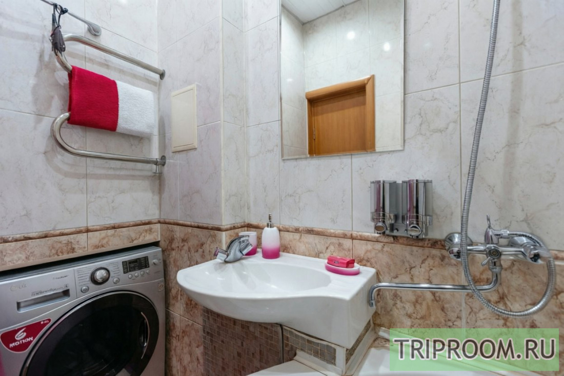 Раздельный санузел оборудован белоснежной сантехникой, угловой ванной. В наличии все принадлежности для полноценного личного ухода гостей - от стиральной машины-автомат до фена и нужных мелочей.